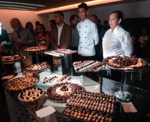 ¿Se imaginan una mesa entera con puro chocolate? Bueno, fue así. Por un momento me sentí como en la fábrica Wonka, pero en vez de Oompa Loompa teníamos: modelos, cantantes, bailarinas y medios informativos. Todos y cada uno ansioso por probar aquella delicia que con tan solo acercarse a la mesa se podía sentir aquel aroma tan exquisito.