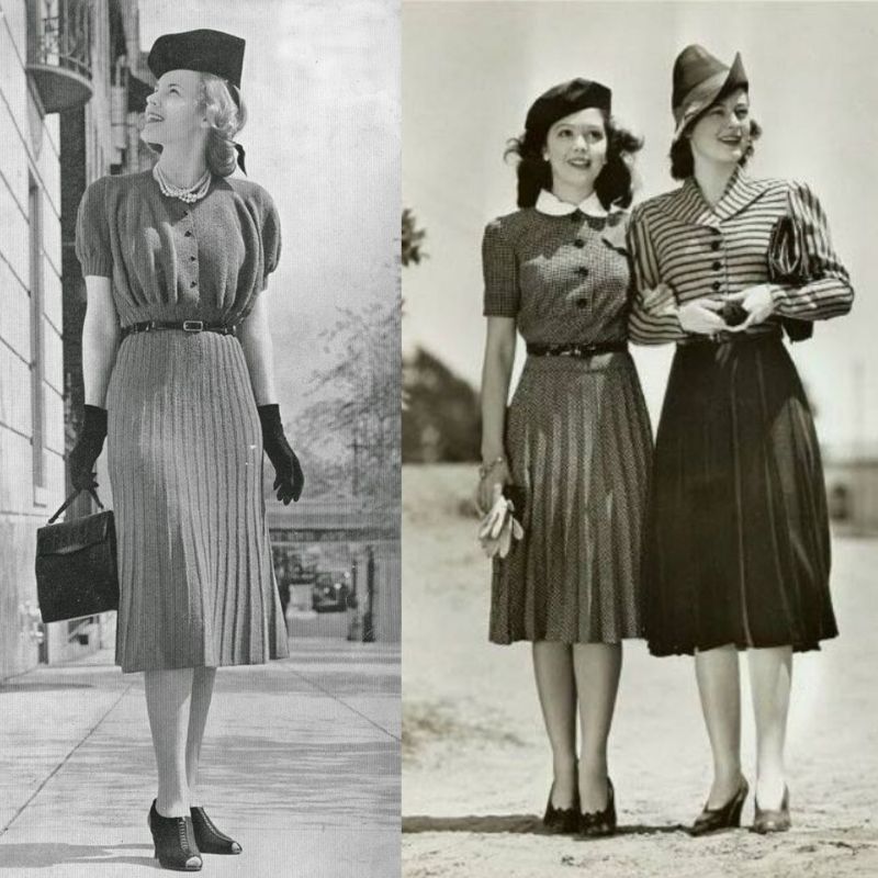 En cuanto a la vestimenta de los años 40, las mujeres utilizaban trajes de entalle para dejar las cinturas muy marcadas, con chaquetas de solapa entalladas y con cinturones anchos. También se utilizaban las faldas midi, por debajo de las rodillas. Fue la época en la que las mujeres se inspiraban en la ropa militar para su día a día, los looks se basaban en trajes de dos piezas en tonalidades verde, gris, negro y beige.