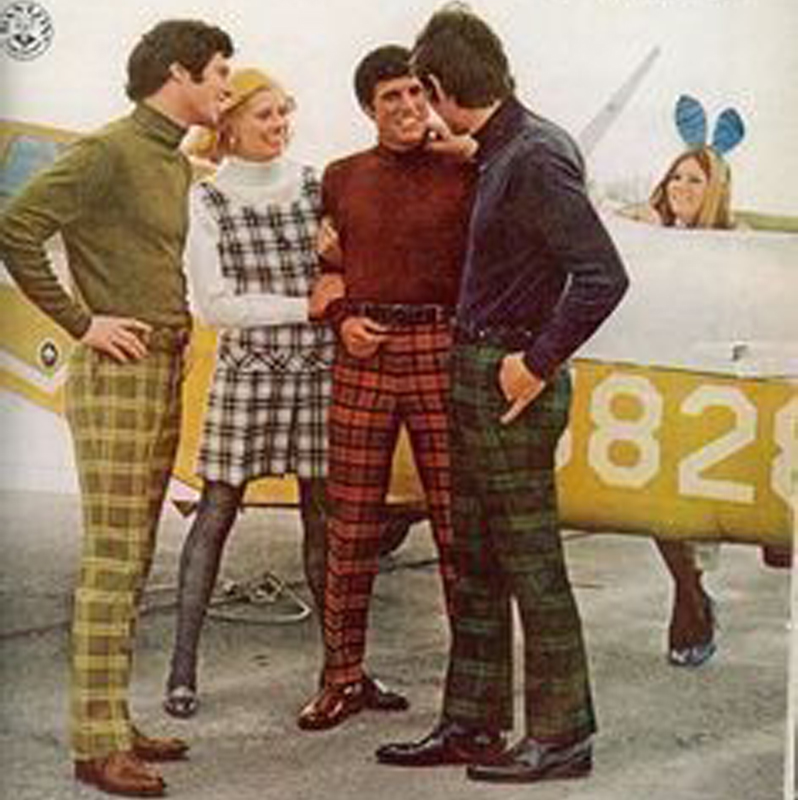 Los hombres se desprenden de los pantalones de vestir, de sacos, corbatas y camisas de cuello y botones, abriéndole paso al concepto de la ropa joven, divertida y experimental. El lujo y la elegancia en la ropa queda para otras ocasiones. Pantalones campana, ceñidos hasta la rodilla y anchos hasta la bota. Combinándolos con franelas coloridas y holgadas. Los accesorios son los lentes grandes y llamativos de pasta y cinturones anchos.