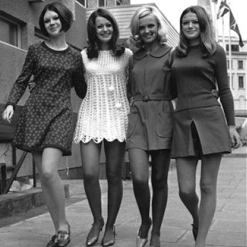 Pantalones campana, ceñidos hasta la rodilla y anchos hasta la bota. Franelas de algodón llegaron para sustituir las camisas de cuello y botones. Se siguen manteniendo los conjuntos de blusa chaqueta y falda y vestidos cortos. Las mujeres en el maquillaje se empiezan a delinear los ojos con gruesas líneas de color negro. Y el cabello se usa corto o con cortes geométricos o al contrario, largo con extensiones. La llegada de la minifalda es una de las prendas más trascendentales de esta década.