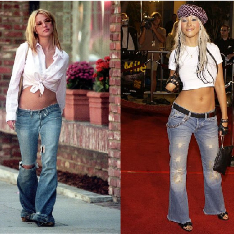 La moda de los años 2000 se vio representada más que nada por los jeans a la cadera y bota ancha. Se volvieron tendencia para lucir el ombligo de las chicas combinado con una franela corta. Se lucían con cinturones anchos y accesorios llamativos. Los jeans de este estilo se volvieron tan populares que se dejaron de producir pantalones a la cintura para solo sacar los de tiro bajo.