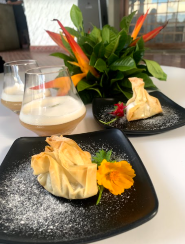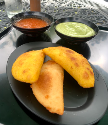 Regresando del recorrido, ya en las mesas se están preparando para hacerte llegar un delicioso trío de empanaditas de queso, pollo y pescado acompañado de una salsa picante y una salsa de reina pepiada ¡Sí! la salsa de reina pepiada es de otro mundo.