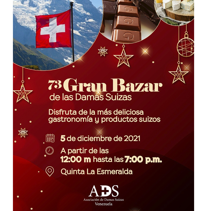 Se acerca la época de regalos, de compartir y dar, de llenar el corazón del otro realizando una buena acción. Para eso está el Gran Bazar de las Damas Suizas que celebran su edición número 73. Han invitado al público caraqueño a la Quinta Esmeralda en Bello Campo a contribuir por una noble causa. El próximo 5 de diciembre a partir del mediodía podrás asistir en familia. Un plan para disfrutar de la mejor gastronomía y productos suizos que tienen para ofrecer.