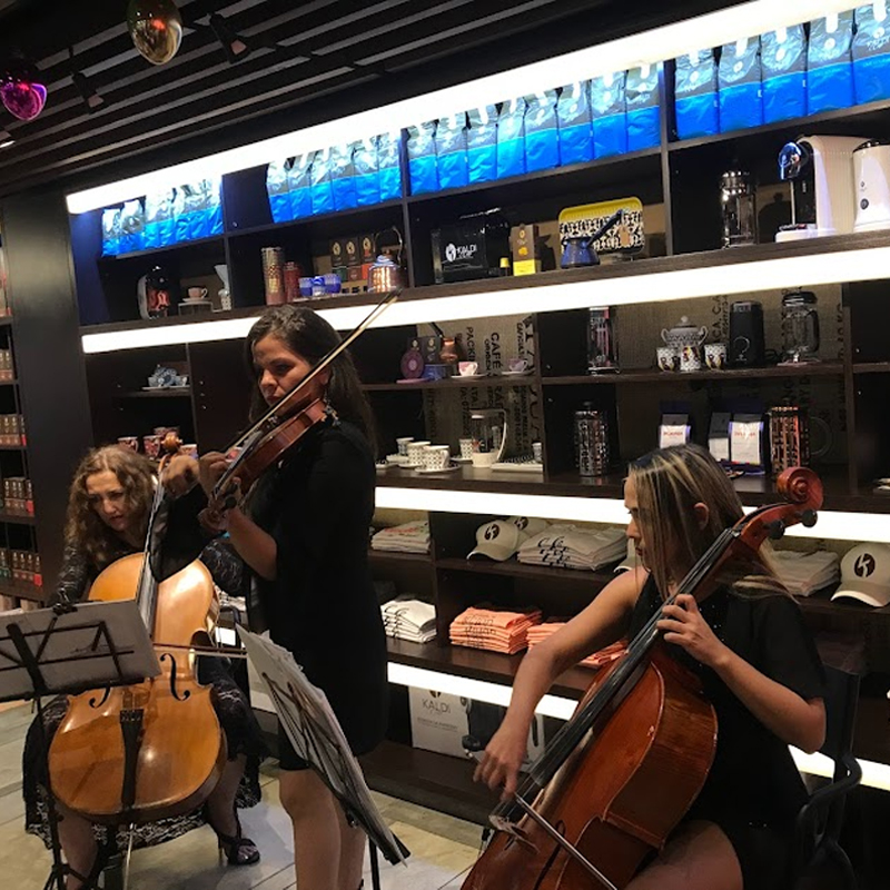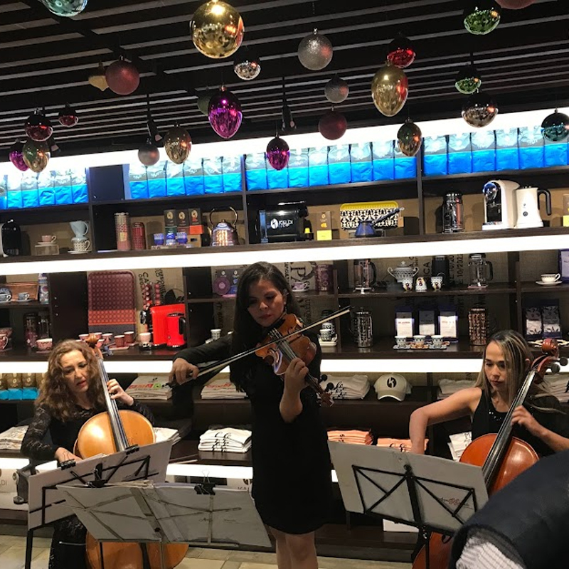 Nos presentaron un café frío cuya base era el ponche y tenía un bastoncito de navidad de adorno. Un detalle especial que se estrenaba ese día junto al encendido de la Navidad y puedes pedir desde ya en su cafetería Kaldi ubicada en Las Mercedes. Para acompañar esta tarde entre risas y sabores especiales, estuvo presente el trío de cuerdas, Apassionato con melodías llenas de pasión.
