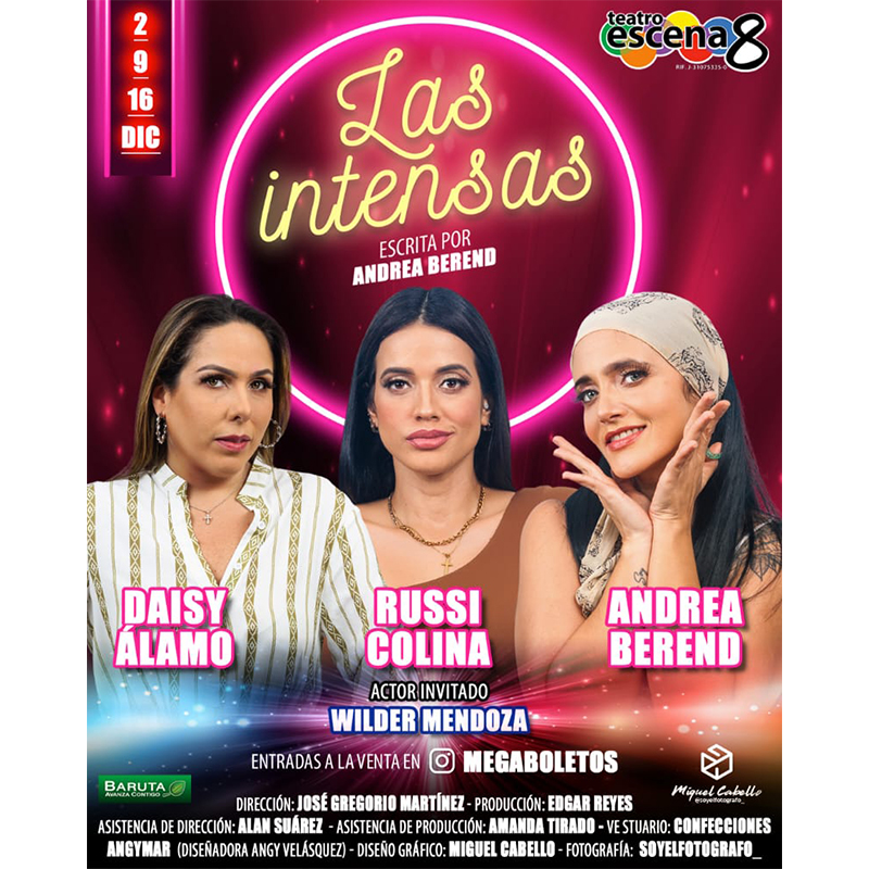 Estuvimos en el estreno a la prensa de Las Intensas, la obra teatral del momento que definitivamente no te puedes perder. El estreno oficial al público fue el 2 de diciembre en el Teatro Escena 8 de Las Mercedes. Con la actuación impresionante de Daisy Alamo, Russi Colina, Andrea Berend y la participación especial de Wilder Mendoza, es sin duda una pieza teatral que no te puedes perder.