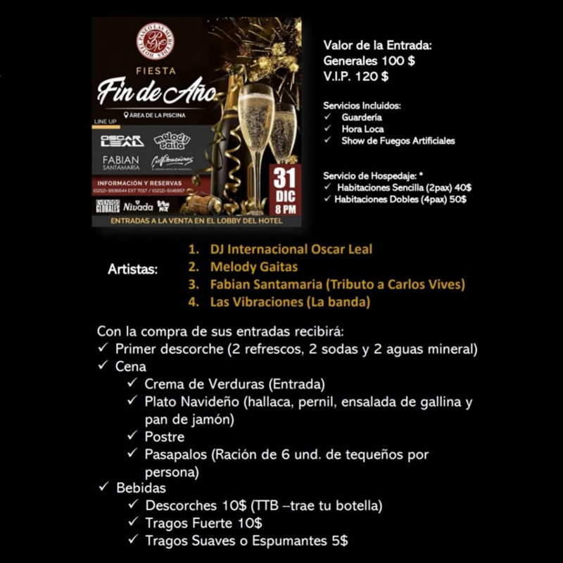 Prepárate para una fiesta con una decoración única, bebidas deliciosas y típicas como vinos, licores, ponches y demás. Incluye también la exquisita cena y pasapalos variados, así como postres y mucho más dependiendo del lugar que elijas para festejar estas fechas. Asimismo, algunos ofrecen en la celebración presentaciones musicales de artistas invitados, esto lo convierte en un plan imperdible.