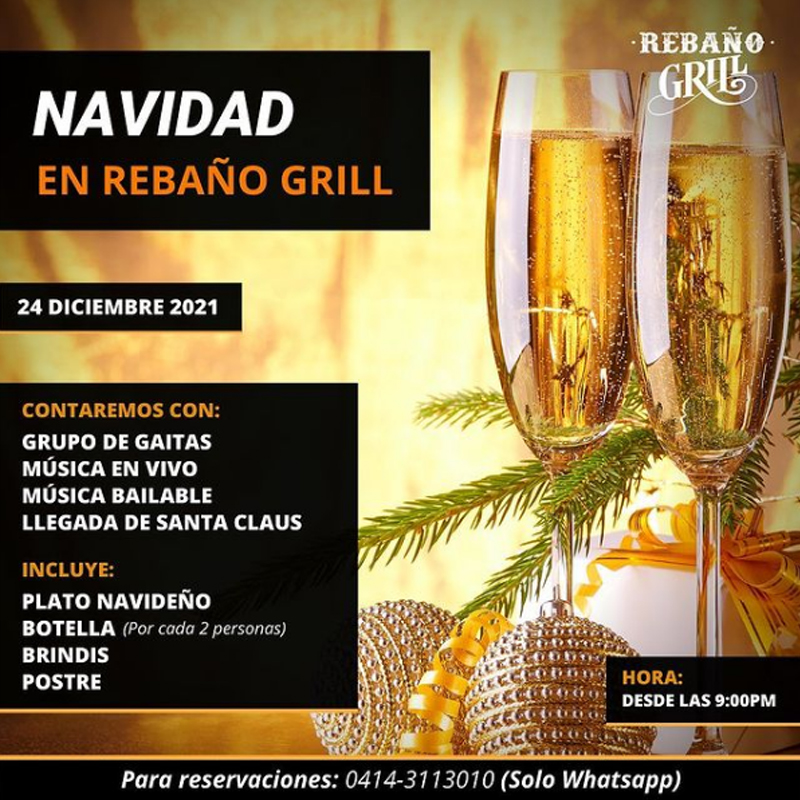 En el restaurant Rebaño Grill ofrecerán una fiesta el 24 de diciembre. Contarán con un grupo de gaitas, música en vivo, un Dj para bailar durante toda la noche, la llegada de Santa Claus y muchas sorpresas más. En la cena ofrecen el plato navideño, una botella por pareja, brindis navideño y postre.