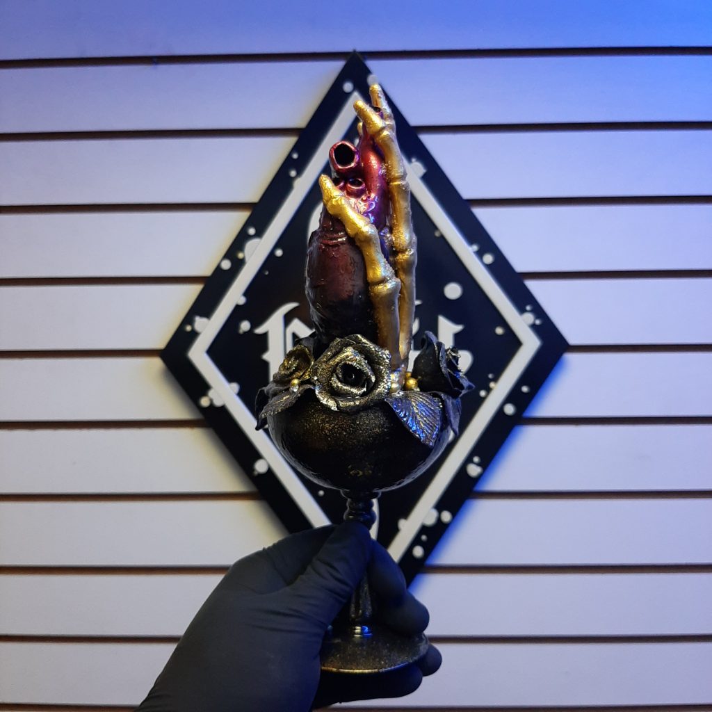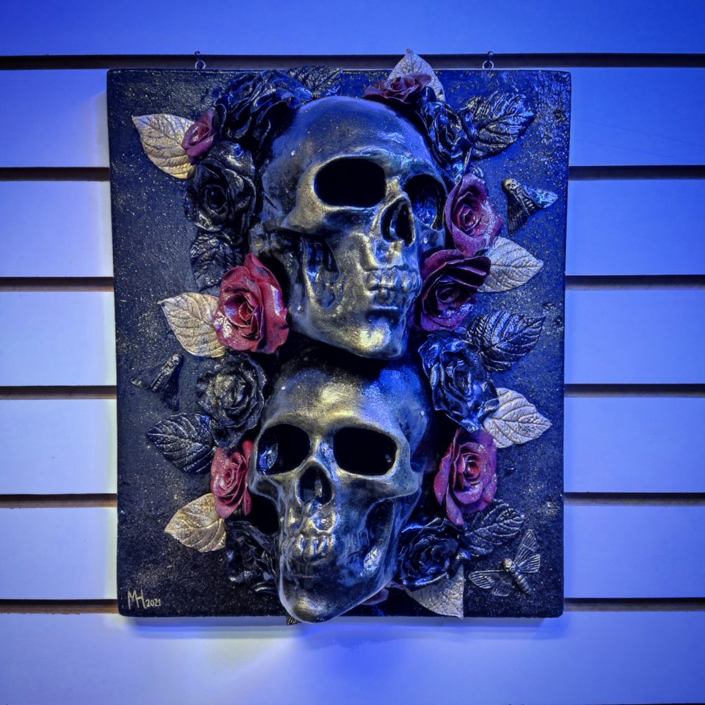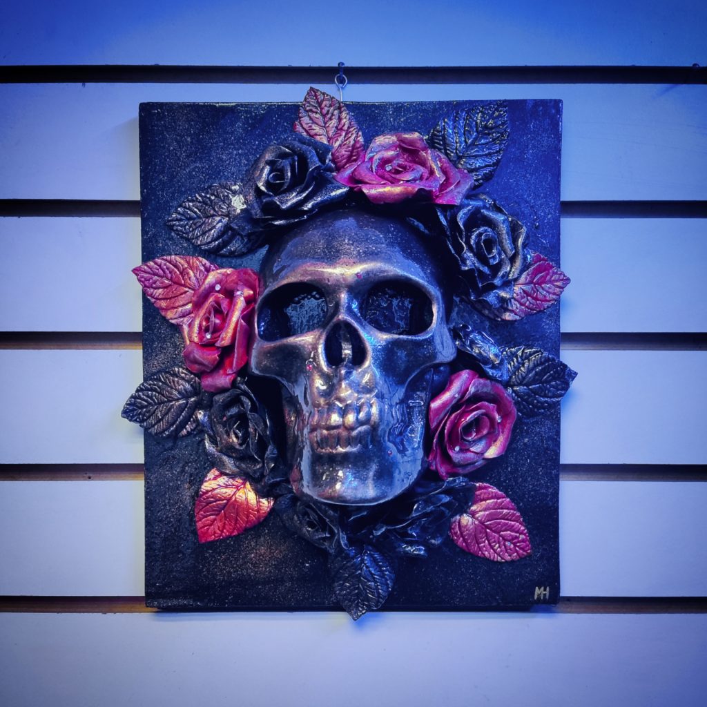 Wow, todas las piezas porque todas son ¡únicas! Pero las más especiales son la Colección Hornskull, El Redskull y la twinskulls que esta es una pieza empotrada en una base de madera con rosas y se puede guindar.