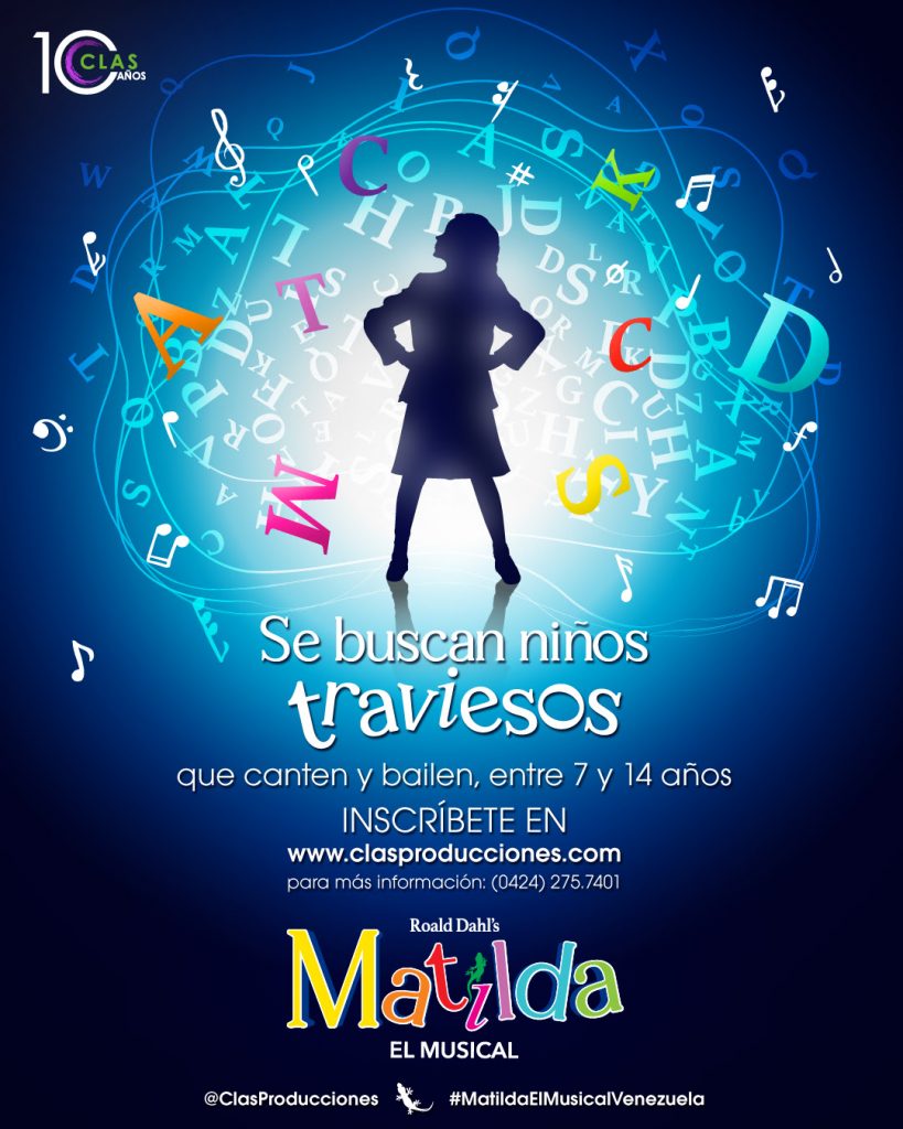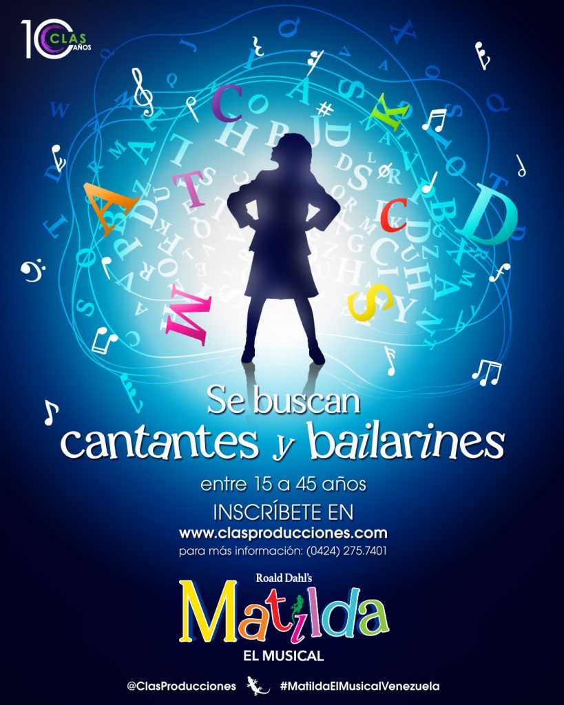 Clas Producciones está en la búsqueda de niños que canten y bailen, entre 7 a 14 años; niños bailarines, entre 7 y 14 años; adultos que canten y bailen, entre 15 y 45 años y adultos bailarines, en el mismo rango de edad, que deben registrarse en www.clasproducciones.com. Una vez inscritos en la web, los participantes deben preparar una (1) canción de su elección en español, preferiblemente de musicales, con su respectiva partitura para piano, aunque también se puede cantar acapella. De quedar preseleccionados en la prueba de canto, los participantes tendrán una prueba de baile posterior. Es importante que los postulantes eviten temas de Matilda.