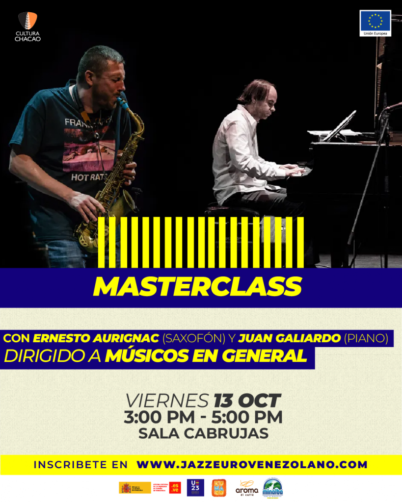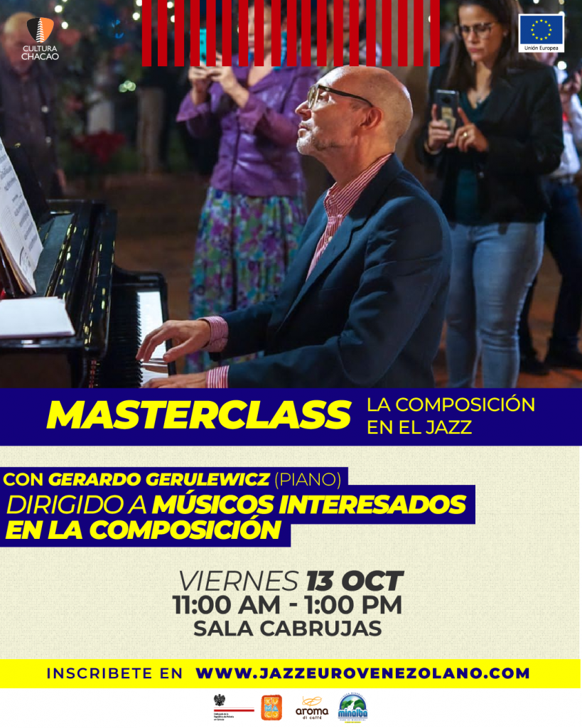El viernes 13 de octubre de 11:00 am a 1:00 pm se llevará a cabo una masterclass con el maestro Gerardo Gerulewicz sobre La composición en el jazz, dirigida a músicos interesados en la composición. Y el mismo día, de 3:00 a 5:00 pm la clase será del pianista español Juan Galiardo y su compatriota, el saxofonista Ernesto Aurignac. Ambas clases tendrán lugar en la Sala Cabrujas de Los Palos Grandes y para inscripciones hay que llenar un formulario disponible en la web www.jazzeurovenezolano.com o por el Instagram @ueenvenezuela.