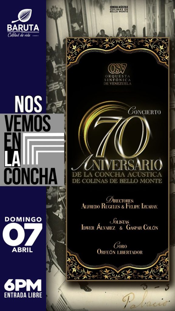 Para celebrar a lo grande el aniversario setenta de “La Concha Acústica de Bello Monte”, este fin de semana la Alcaldía de Baruta ha preparado una programación especial en el marco de “Nos Vemos En La Concha”, primero con la presentación de la exitosa pieza teatral “Sangre en diván” con Héctor Manrique este sábado 06 de abril a las 7:00 pm y con un cierre con “broche de oro” el domingo 07 de abril a las 6:00 pm, con un concierto emblemático de La Orquesta Sinfónica de Venezuela, bajo la dirección de los maestros Alfredo Rugeles y Felipe Izcaray, ambos días con entrada totalmente libre para los ciudadanos, quienes pueden acceder a este recinto cultural ubicado en Colinas de Bello Monte desde las 5:00 pm, con seguridad garantizada por parte de la alcaldía y para el deleite de todos los caraqueños.