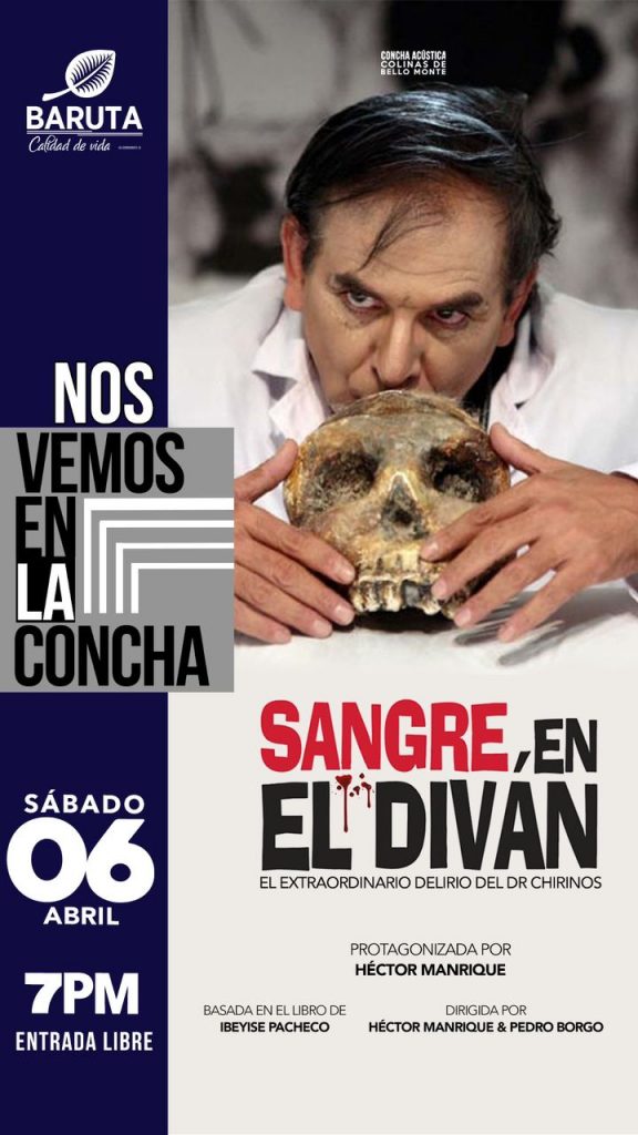 La afamada obra “Sangre en el diván”, que recrea uno de los casos más controvertidos de la historia contemporánea venezolana, protagonizada por Héctor Manrique bajo la piel de Edmundo Chirinos y dirigida por Manrique y Pedro Borgo, es la encargada de abrir esta celebración con su función a las 7:00 pm el sábado 06 de abril en La Concha Acústica de Bello Monte, en el marco de los especiales “Nos Vemos en La Concha”, programación cultural gratuita creada bajo la gestión del alcalde Darwing González, que desde su inauguración en 2018 hasta el presente, ha presentado más de 60 espectáculos para toda la familia, entre los que destacan las obras: “El día que me quieras”, “El hombre de la Mancha”, “El Mistral”, “Renny Presente”, “Improvisto”, “Monólogos de la Vagina”, “La Señora Imber”, “La Ternura”; shows musicales de la Orquesta Gran Mariscal de Ayacucho, del Festival de San Remo, de Huascar Barradas, Los Vasallos del Sol y conciertos de cantantes de la talla de Yordano, Ilan Chester y Karina.