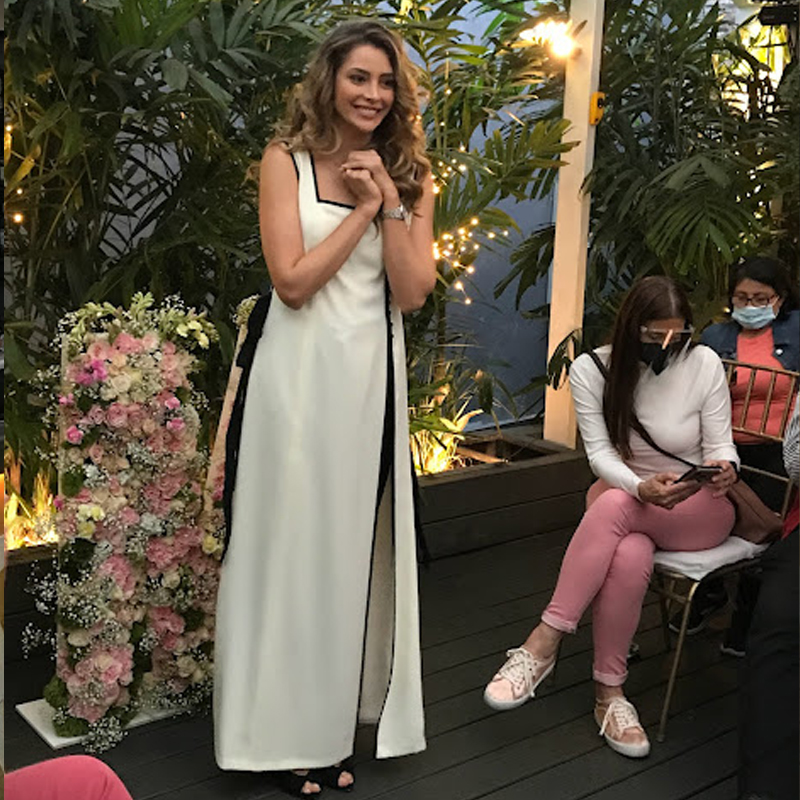 Al culminar el desfile, Maydeliana Díaz pasó a agradecer a los asistentes luciendo una prenda más de la colección con aberturas a los lados que la hacían lucir muy elegante. Nos contó que este ha sido un trabajo realizado minuciosamente y agradeció a las personas que la han apoyado en todo este proceso.