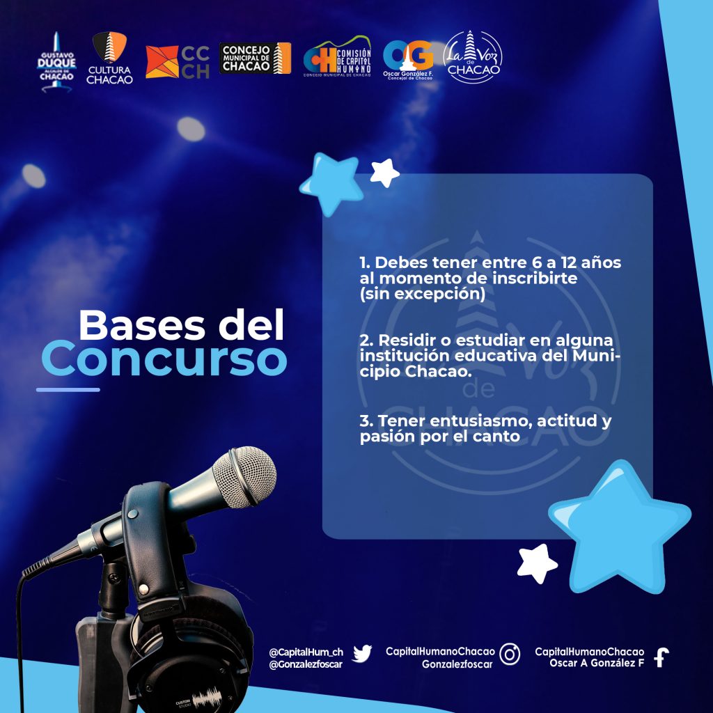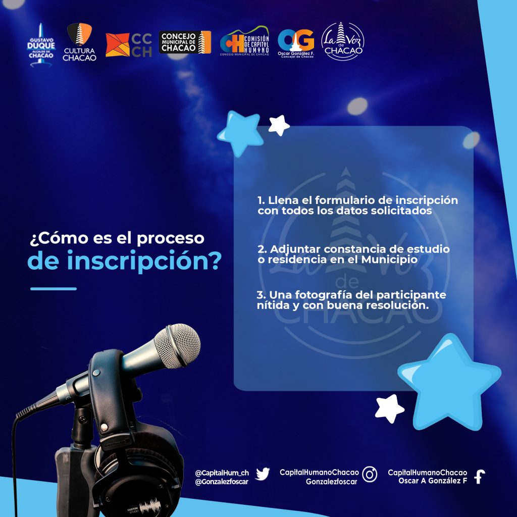 A partir del 1 de agosto hasta el 18 de septiembre, los niños con edades comprendidas entre 6 a 12 años que sean residentes o estudiantes formales de instituciones educativas en Chacao, podrán inscribirse para mostrar su talento como cantante en la VII edición de «La Voz de Chacao 2022». Para inscribirse dentro del concurso se debe llenar un formulario con todos los datos que allí se solicitan, adjuntar constancia de estudio o residencia del municipio y agregar una fotografía del participante.